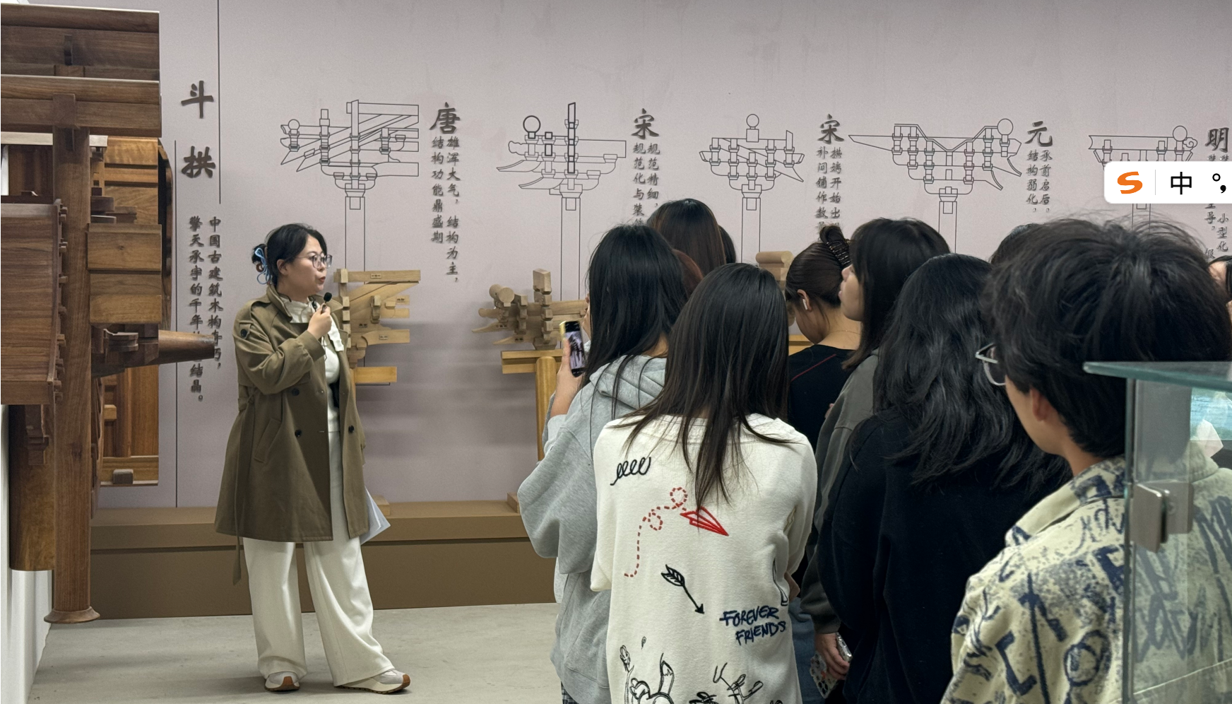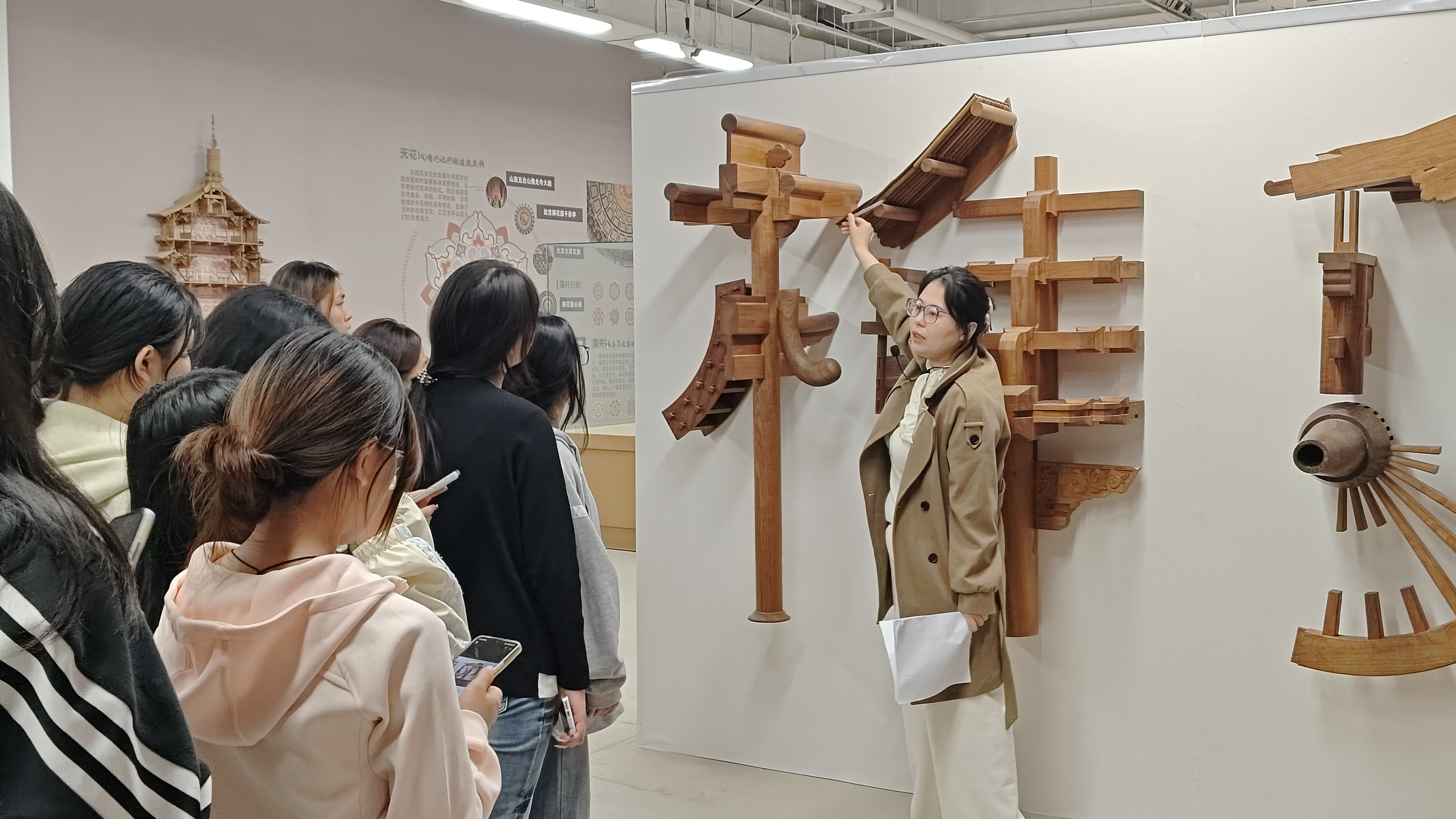 活动伊始,“古建美学导览”环节在专业讲解员的带领下拉开帷幕。学生们走进建筑技术发展历程展区,重点聆听中国古代建筑的美学特征——从飞檐斗拱的灵动造型到雕梁画栋的纹样寓意,从对称布局的和谐之美到“天人合一”的文化象征,每一处细节都让大家深深沉浸于传统建筑的魅力之中。讲解员更特别结合经贸视角,引导同学们探讨古建筑建造背后的组织管理逻辑与资源调度策略,让“美”与“管理”的跨界思考从活动之初便扎下根基。