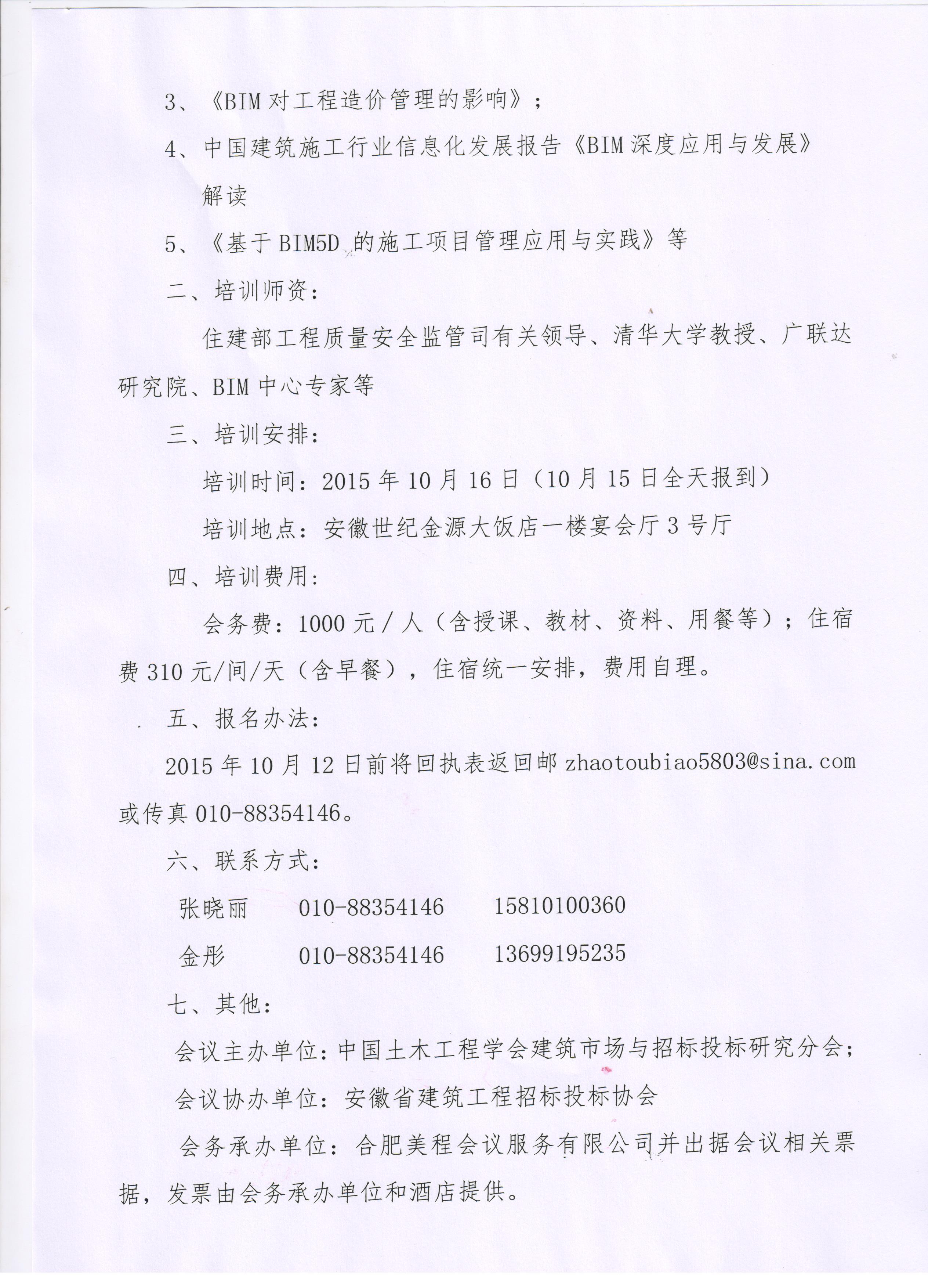 为贯彻《关于印发2011-2015年建筑业信息化发展纲要的通知》(建质[2011]67号)和《住房城乡建设部关于推进建筑业发展和改革的若干意见》(建市[2014]92号)的有关工作部署,中国土木工程学会建筑市场与招标投标研究分会于8月26-28日北京举办“BIM技术与招投标高级培训班”,此次培训引起与会者的极大兴趣和强烈反响,应安徽及各省有关部门建议,“分会”定于10月15-16日在安徽合肥举办第二期BIM技术与招投标高级培训班。望有关单位,安排好相关人员参加培训学习。培训结束颁发《培训结业证书》。