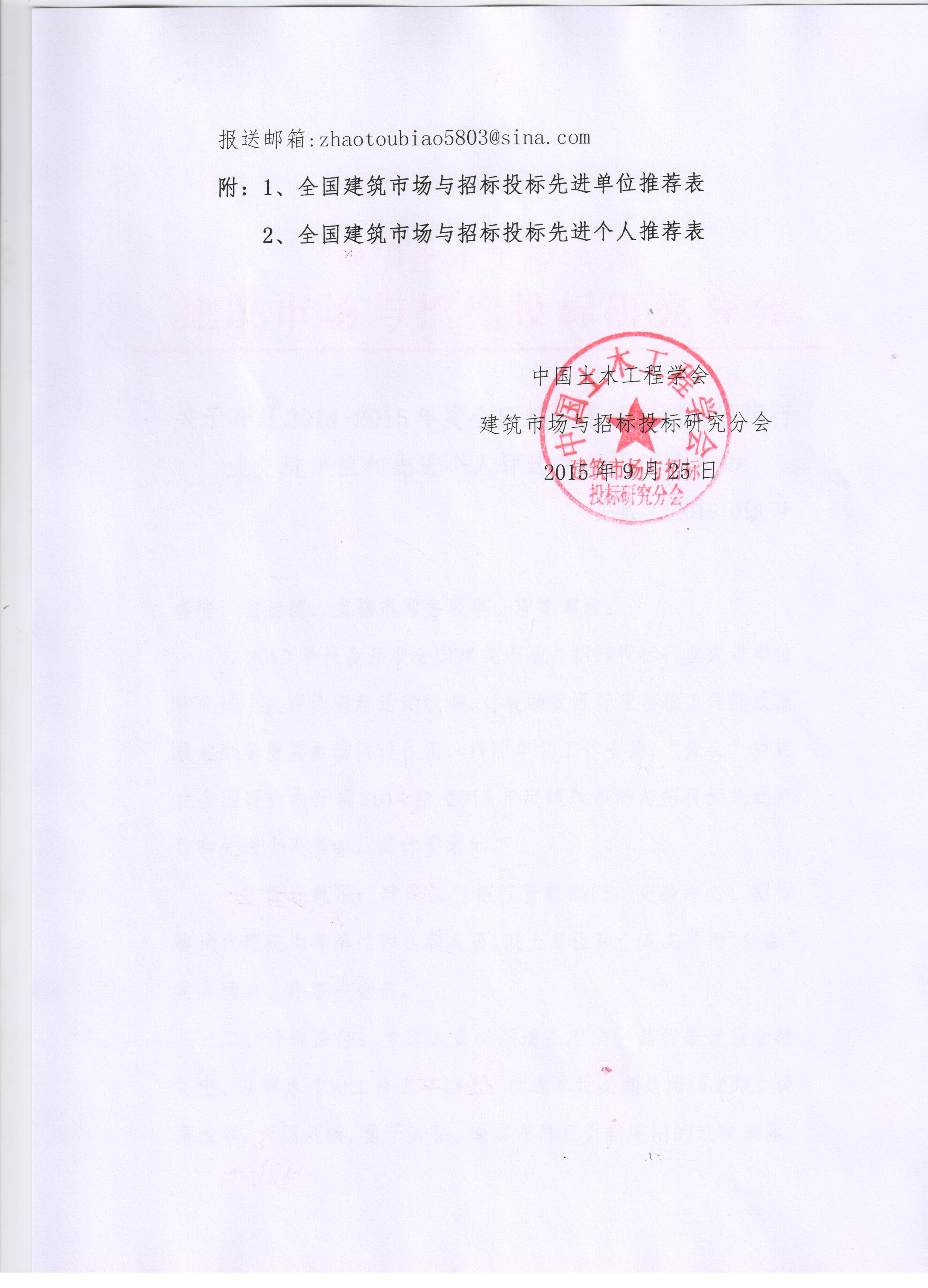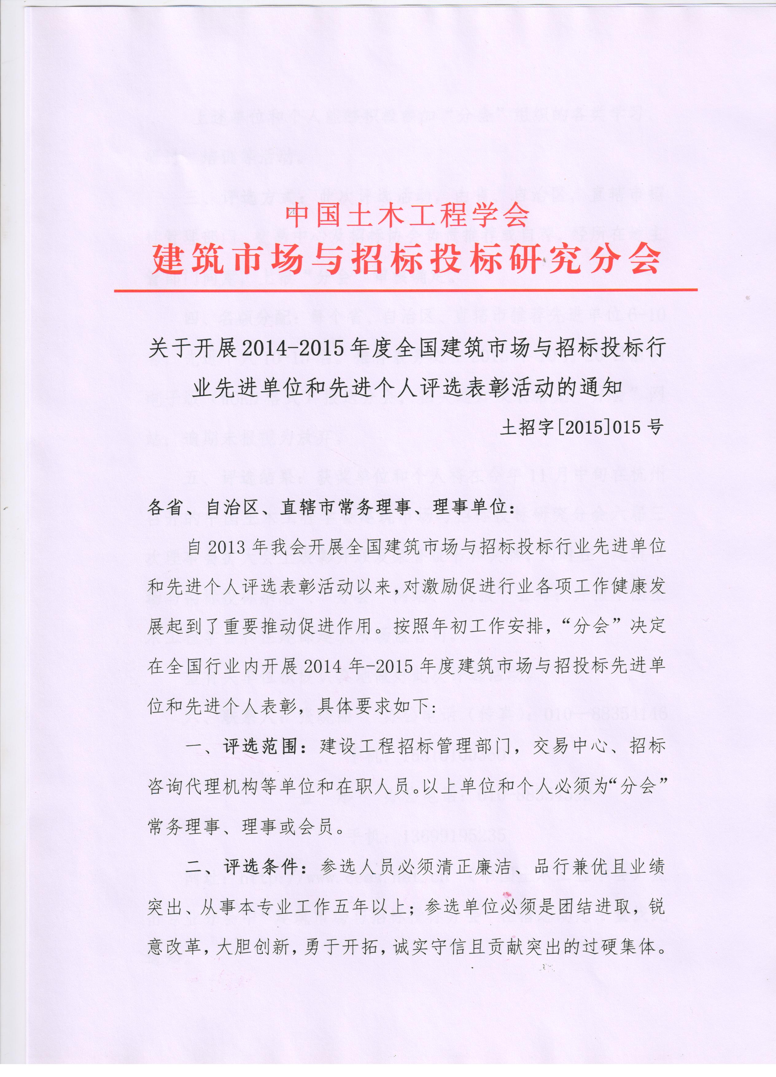 关于开展2014-2015年度全国建筑市场与招标投标行业先进单位和先进个人评选表彰活动的通知