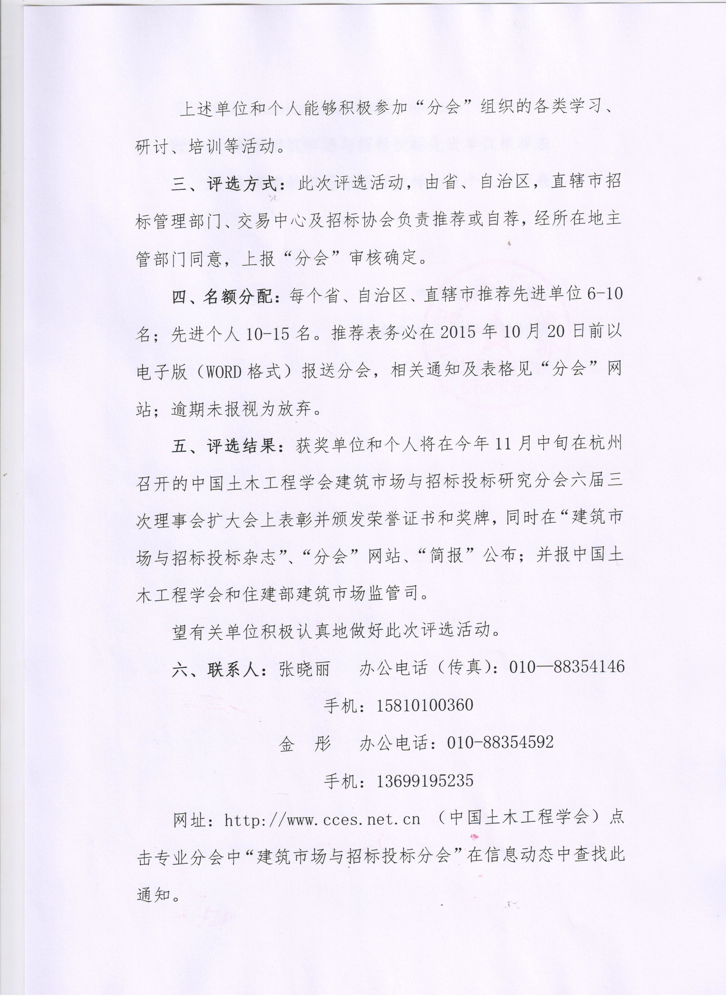 五、评选结果:获奖单位和个人将在今年11月中旬在杭州召开的中国土木工程学会建筑市场与招标投标研究分会六届三次理事会扩大会上表彰并颁发荣誉证书和奖牌,同时在“建筑市场与招标投标杂志”、“分会”网站、“简报”公布;并报中国土木工程学会和住建部建筑市场监管司。
