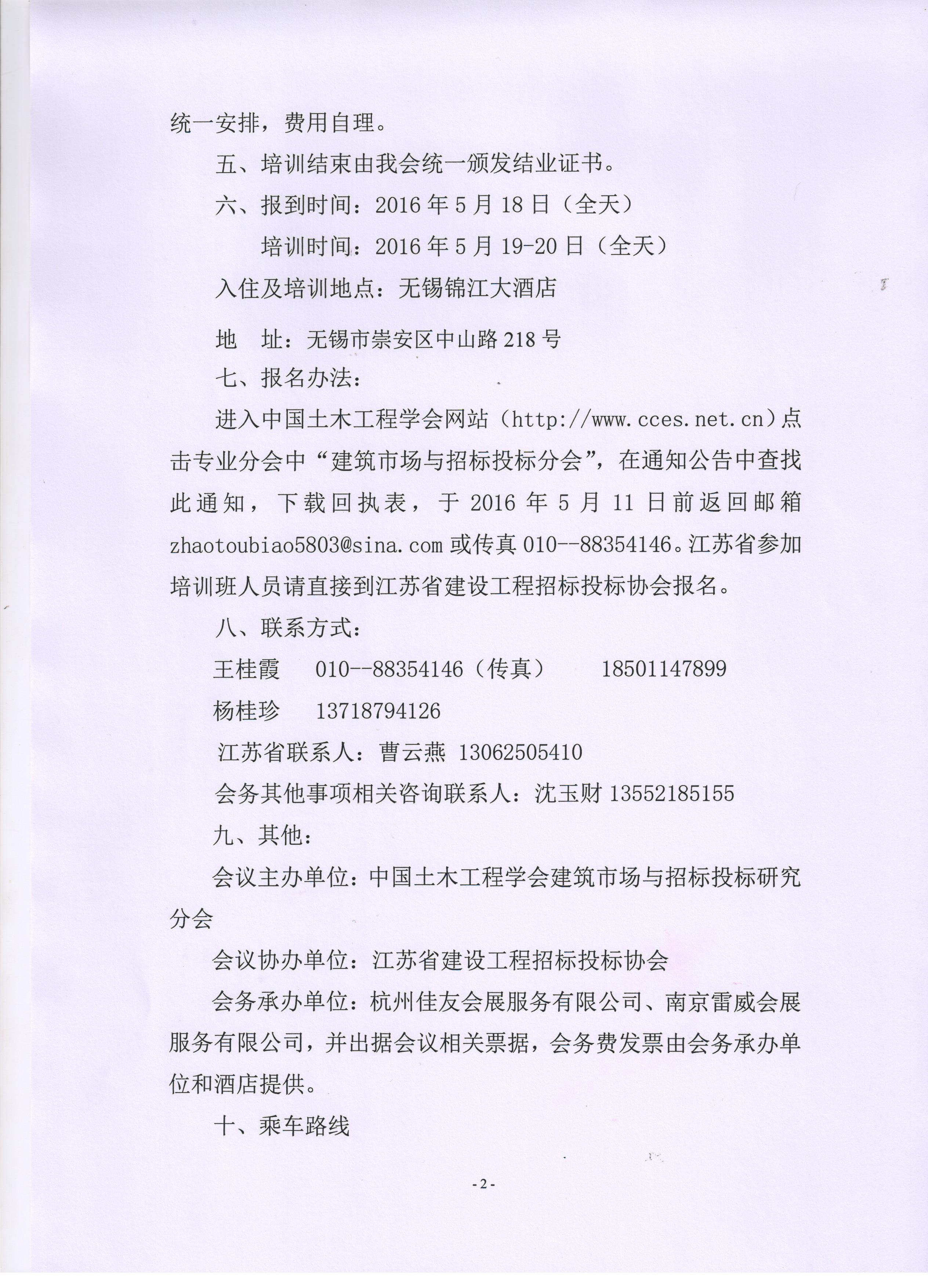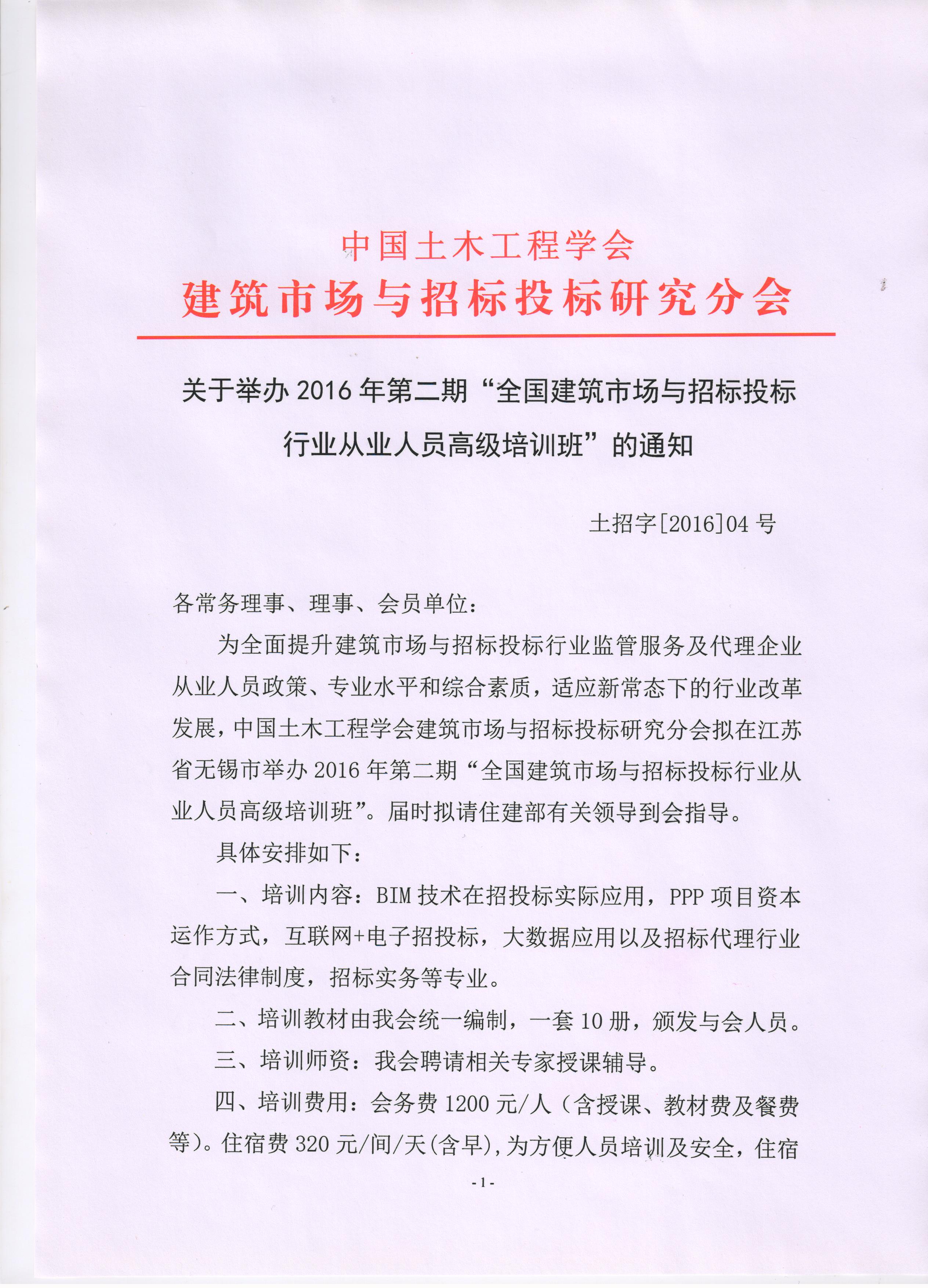 为全面提升建筑市场与招标投标行业监管服务及代理企业从业人员政策、专业水平和综合素质,适应新常态下的行业改革发展,中国土木工程学会建筑市场与招标投标研究分会拟在江苏省无锡市举办2016年第二期“全国建筑市场与招标投标行业从业人员高级培训班”。届时拟请住建部有关领导到会指导。