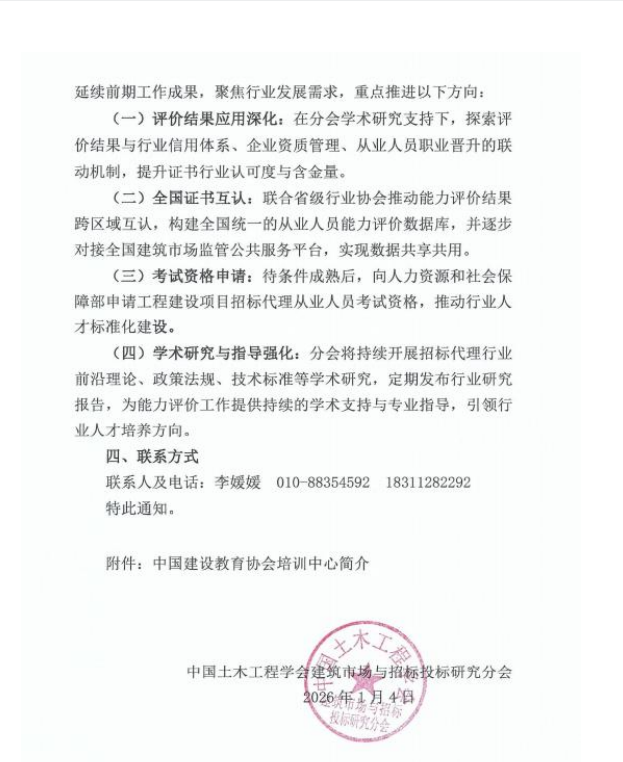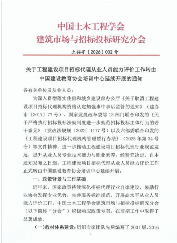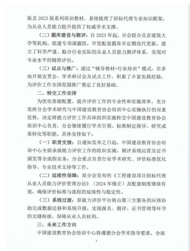 关于工程建设项目招标代理从业人员能力评价工作转由中国建设教育协会培训中心延续开展的通知