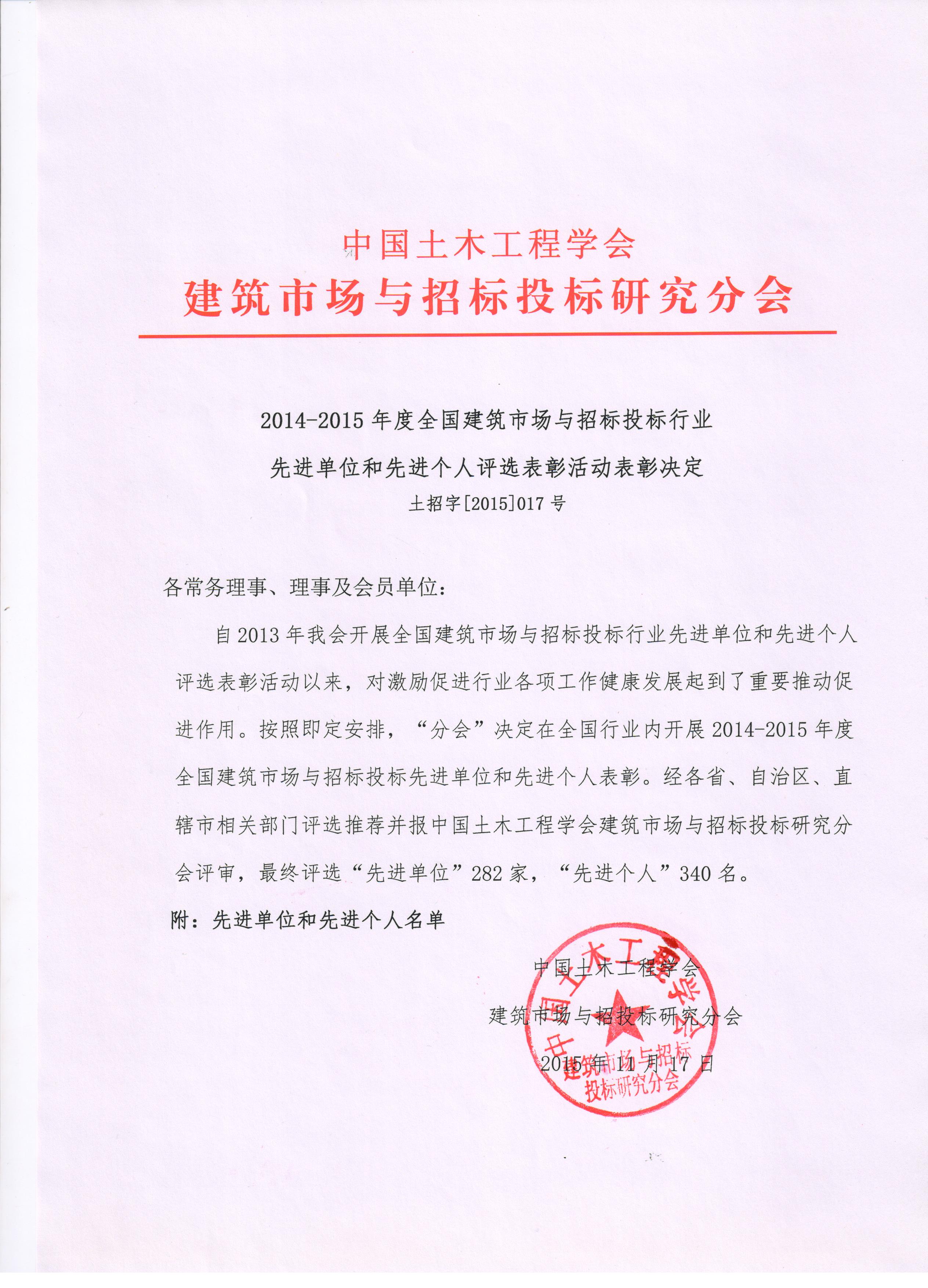 自2013年我会开展全国建筑市场与招标投标行业先进单位和先进个人评选表彰活动以来,对激励促进行业各项工作健康发展起到了重要推动促进作用。按照即定安排,“分会”决定在全国行业内开展2014-2015年度全国建筑市场与招标投标先进单位和先进个人表彰。经各省、自治区、直辖市相关部门评选推荐并报中国土木工程学会建筑市场与招标投标研究分会评审,最终评选“先进单位”282家,“先进个人”340名。