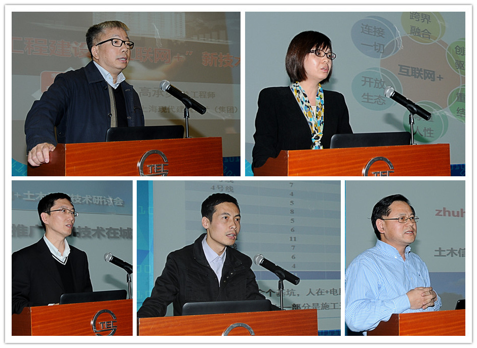 研讨会上共作了五个精彩报告,分别从土木工程建造技术、设计、施工、管理等全面阐述了互联网与土木工程科技的关系:上海现代设计集团总工高承勇的《工程建设行业“互联网+”新技术与新模式发展趋势》、上海建工集团副总工王美华的《互联网+土木工程建造技术的应用和展望》、上海隧道设计研究院副总工陈鸿的《积极推动BIM技术在城市轨道交通行业的应用》、上海隧道工程有限公司潘伟强项目总工的《基于数据融合的深基坑风险预警技术和平台》、同济大学教授朱合华的《智慧城市基础设施建设与实践》。
