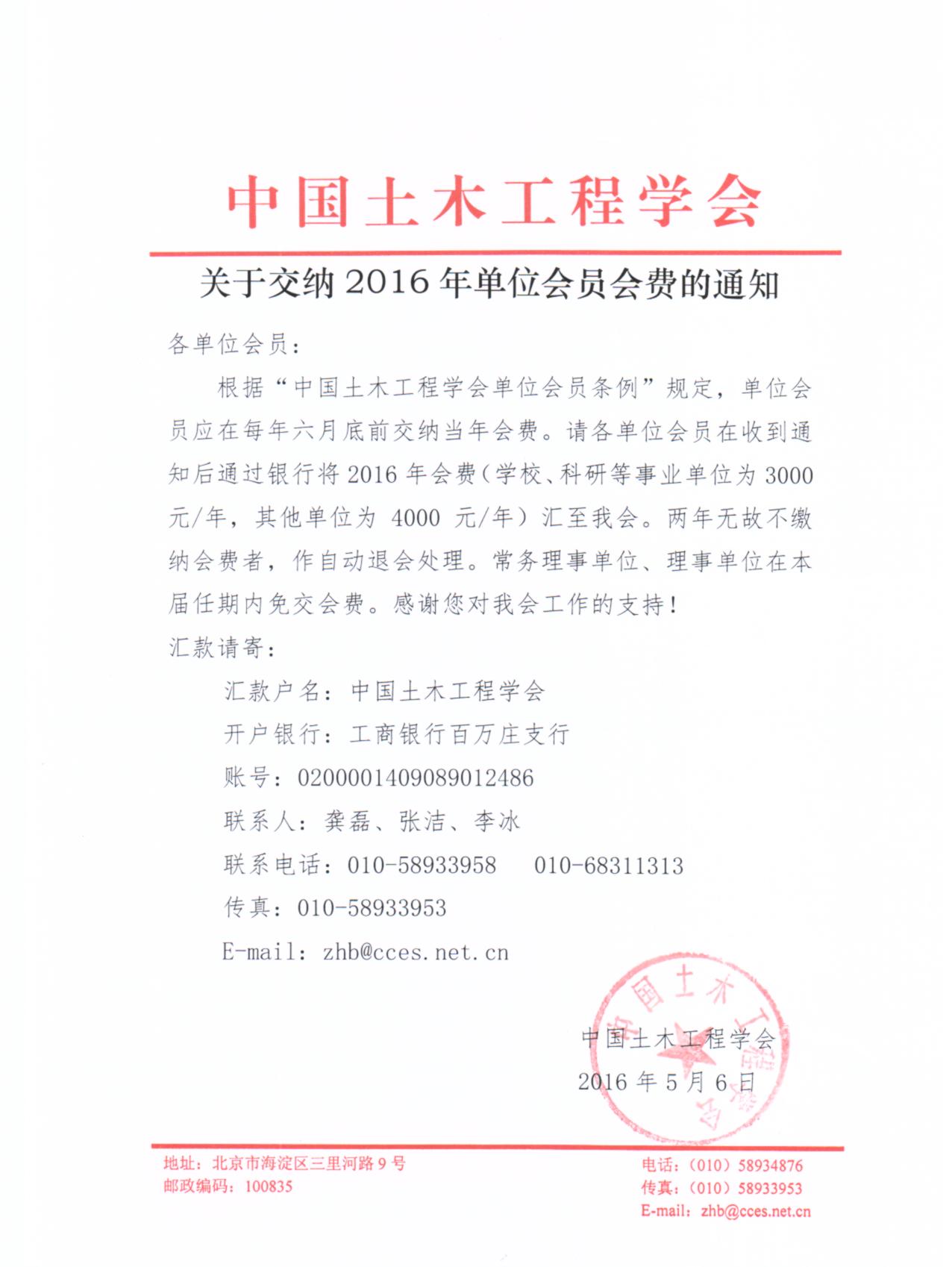 根据“中国土木工程学会单位会员条例”规定,单位会员应在每年六月底前交纳当年会费。请各单位会员在收到通知后通过银行将2016年会费(学校、科研等事业单位为3000元/年,其他单位为4000元/年)汇至我会。两年无故不缴纳会费者,作自动退会处理。常务理事单位、理事单位在本届任期内免交会费。感谢您对我会工作的支持!