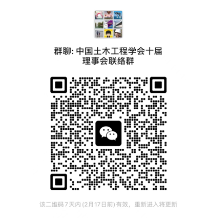 2、为加强沟通交流,请还未加入“中国土木工程学会十届理事会联络群(微信群)”的常务理事,扫描下方二维码进群(二维码7天内有效),有关会议事项将在微信群及时发布。如微信群二维码过期,可添加刘渊手机号(13611236302)进群。