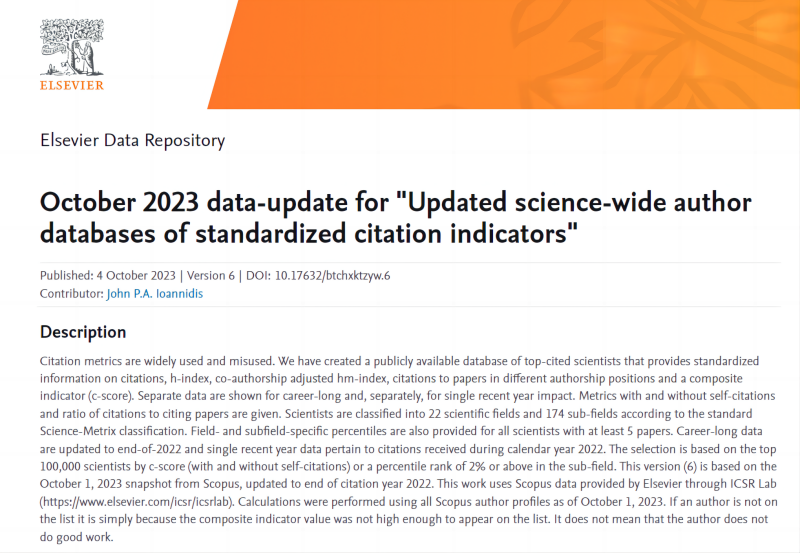 2023年10月4日,美国斯坦福大学John P. A. Ioannidis教授团队和爱思唯尔数据库(Elsevier Data Repository)发布了第六版《全球前2%顶尖科学家榜单》(World’s Top 2% Scientists)。该榜单基于Scopus数据库,依照科技工作者科研产出、Google Scholar Metrics期刊评分、H指数、成果被引、成果中作者排序位置等参数进行综合评估,从22个科学领域和176个子方向,近700万名科学家中遴选出排名前2%的科学家,旨在提供一个科学家长期科研表现的衡量指标。