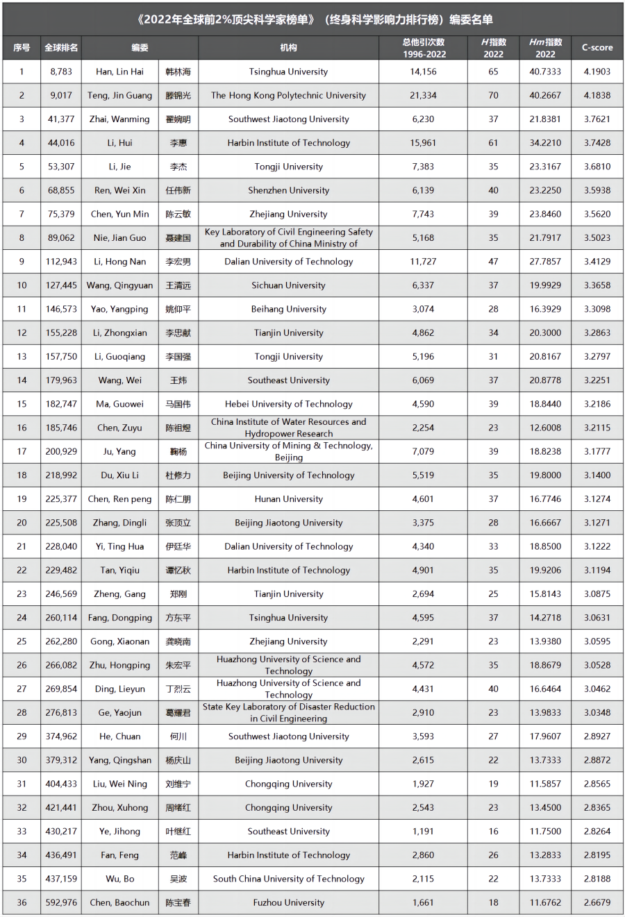 《土木工程学报》36位编委入选全球前2%顶尖科学家“终身科学影响力排行榜”