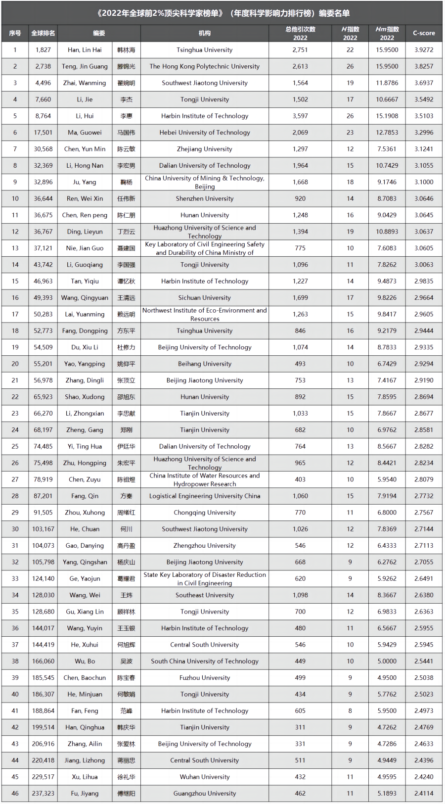 《土木工程学报》46位编委入选全球前2%顶尖科学家“年度科学影响力排行榜”