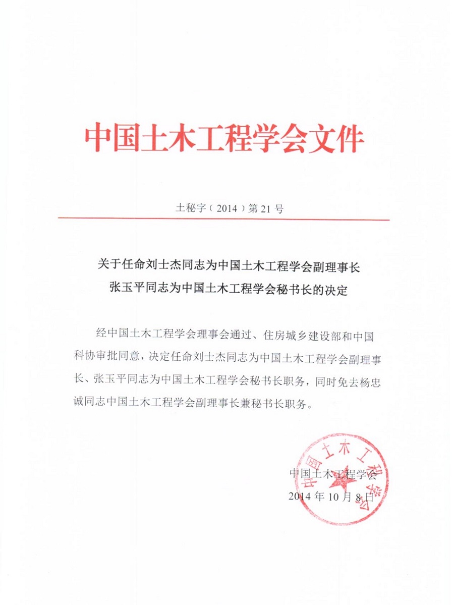 关于任命刘士杰同志为中国土木工程学会副理事长张玉平同志为中国土木工程学会秘书长的决定