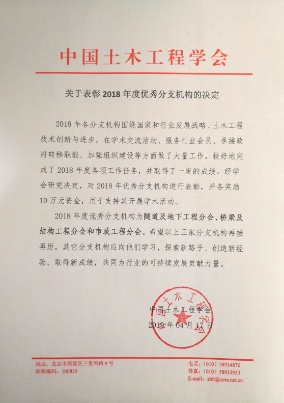 2018年各分支机构围绕国家和行业发展战略、土木工程技术创新与进步,在学术交流活动、服务行业会员、承接政府转移职能、加强组织建设等方面做了大量工作,较好地完成了2018年度各项工作任务,并取得了一定的成绩。经学会研究决定,对2018年优秀分支机构进行表彰,并各奖励10万元资金,用于支持其开展学术活动。