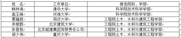 按照中国科协文件,我会制定了“中国土木工程学会2021年推选院士候选人工作方案”,成立了“推选工作组织机构”,经我会所属分支机构、会员单位推选,推选院士候选人工作小组审核合格后,我会于2月中下旬邀请专家对候选人材料进行评审,经推选专家委员会投票,按照得票不少于投票人数三分之二原则,确定韩林海等6位专家为中国土木工程学会向中国科协推荐的两院院士候选人。