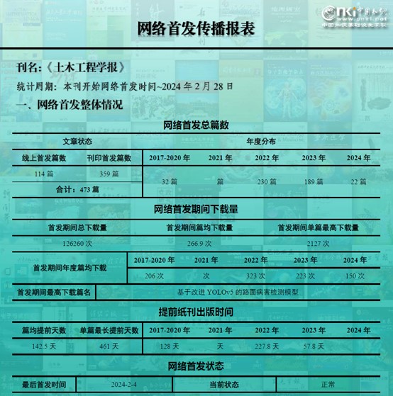 3月8日,《土木工程学报》收到来自中国知网统计的网络首发数据。自2018年以来,《土木工程学报》在中国知网线上首发篇数114篇,刊印首发篇数359篇,合计首发篇数473篇。首发期间,《土木工程学报》文章总下载量近13万次,单篇最高下载量2127次,篇均下载量266.9次,篇均提前天数142.5天,单篇最高提前天数461天(数据截至2024年2月28日)。
