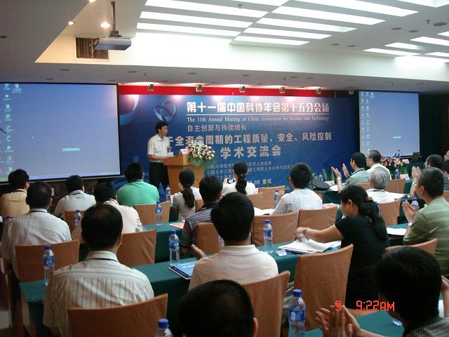 按照会议日程安排,9月8日,与会代表参加了在重庆市人民大礼堂举行的第十一届中国科协年会开幕式及大会。本届年会的主题是“自主创新与持续增长”,包括150余位两院院士在内的3500多名来自全国各地、各学科领域,工作在科研、生产、教学第一线的科技工作者参加了开幕式及大会。开幕式由中国科协常务副主席、书记处第一书记邓楠主持,全国人大常委会副委员长、中国科协主席、本届年会主席韩启德为年会致开幕词。开幕式上,颁发了香港求是科技基金会求是杰出科学家奖、中国科协求是杰出青年奖、周光召基金会应用科学奖和临床医师奖。开幕式结束后,全国人大常委会副委员长、中国科学院院长路甬祥,全国政协原副主席、中国工程院院长徐匡迪,重庆市委副书记、市长王鸿举,中国工程院副院长、中国工程院院士邬贺铨,铁道部副总工、客运专线(高速铁路)副总设计师、中国铁道科学研究院首席专家张曙光,香港城市大学、中国工程院外籍院士、美国国家工程院院士郭位等7位领导和专家作了大会特邀报告。9月9日召开了第15分会场“基于全寿命周期的工程质量、安全、风险控制学术交流会”,本次会议以贯彻落实科学发展观与促进我国工程建设行业持久健康发展为宗旨,紧紧围绕“工程建设中存在的工程风险与工程质量安全问题”这一主题进行探讨交流。第十五分会场主席、中国土木工程学会张雁秘书长,重庆市土木建筑学会理事长、重庆大学常务副校长张四平先生出席开幕式并分别致辞。张雁秘书长在致辞中指出,当前工程技术的发展已经开始从单纯使用阶段的安全设计向工程全寿命周期的综合与决策过渡。针对我国当前研究和大规模建设中存在的问题,一要大力提倡工程全寿命周期理念,强化工程风险管理与工程质量安全,二要加强工程全寿命周期的基础理论研究,三要建立健全工程全寿命周期标准体系与相关制度建设。中国工程院土木水利与建筑工程学部高战军处长、重庆市城乡建设委员会丛钢副主任、中国工程院周丰峻院士等领导和专家出席了分会场开幕式。重庆市土木建筑学会副理事长、解放军后勤工程学院少将程华主持了分会场开幕式及学术交流会。
