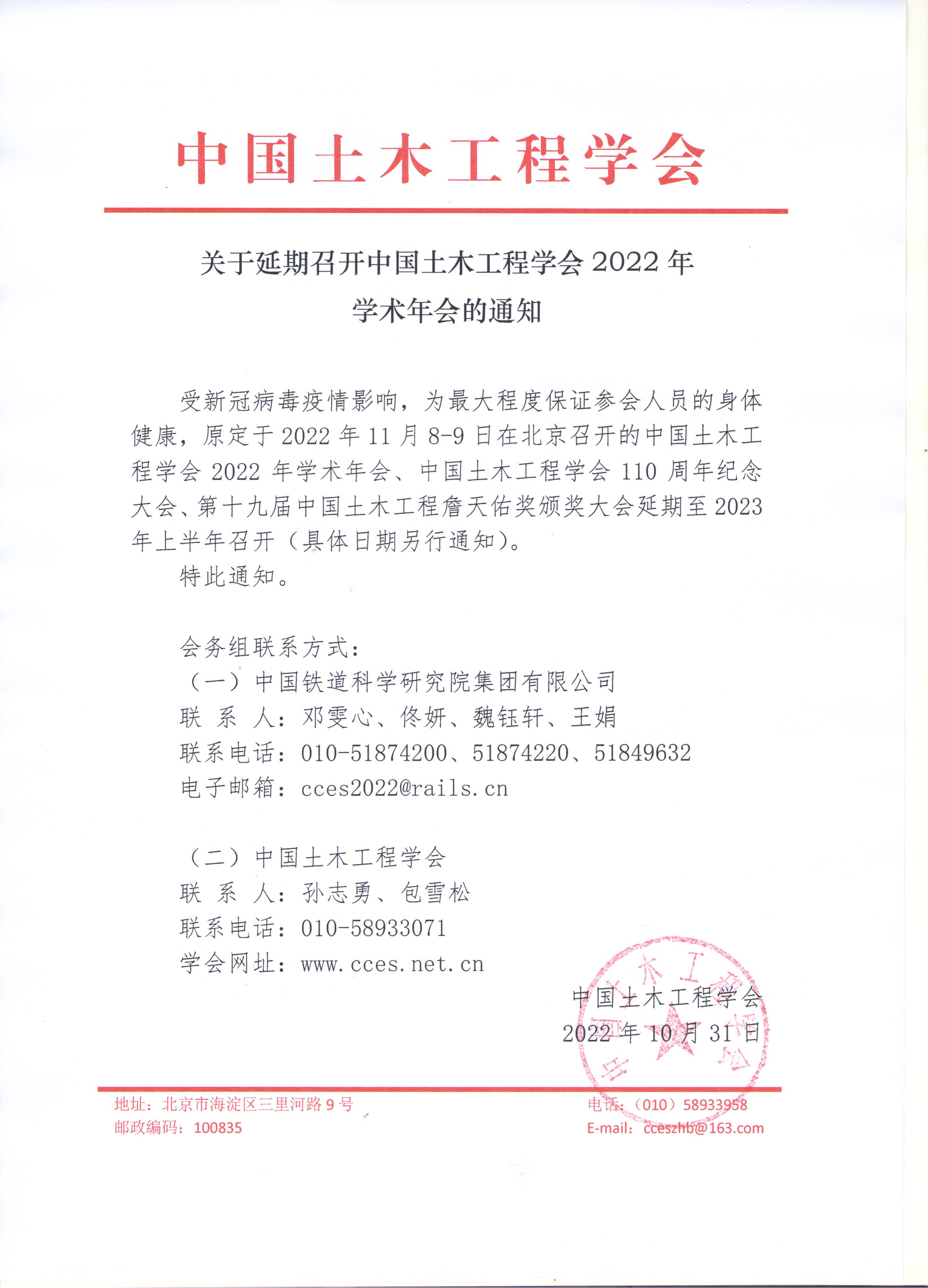 受新冠病毒疫情影响,为最大程度保证参会人员的身体健康,原定于2022年11月8-9日在北京召开的中国土木工程学会2022年学术年会、中国土木工程学会110周年纪念大会、第十九届中国土木工程詹天佑奖颁奖大会延期至2023年上半年召开(具体日期另行通知)。