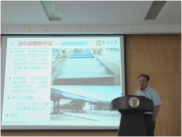 随后丁汉山教授做了题为“波形钢腹板曲线梁桥的力学特性”的报告。丁教授首先介绍了波形钢腹板梁桥的发展历程和国内外工程应用现状;结合多年研究成果,重点剖析了波形钢腹板曲线梁桥的复杂受力特征,包括弯扭耦合受力、剪滞效应、腹板受剪和屈曲、变形特征等。