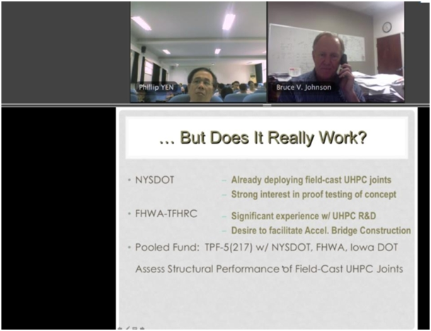 上午,Bruce Johnson博士以“Bridge Construction Using Ultra-high Performance Concrete”为题进行网络授课。Johnson博士详细介绍了UHPC(超高性能混凝土)的材料性能、力学行为、施工工艺和应用范围。随后,他结合UPRR Bridge等桥梁工程案例,重点阐述了现浇UHPC接缝在预制桥面板中的应用,包括接缝构造、施工工艺和受力性能等。