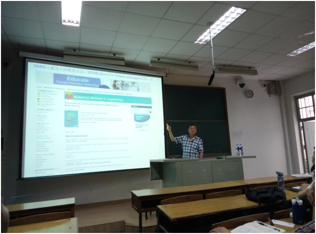 下午,郑宏教授为学员们带来了题为“计算力学史上几个待解问题的流形法方案”的主题报告,郑教授分别从数值流形法能做什么、NMM基础、与现代其他数值方法的关系与NMM的一些典型应用等方面为大家进行介绍。在第一部分的内容中,郑教授向学员们说明了NMM能够做FEM所做的一切、连续和非连续问题的统一求解以及自由边值问题。接着郑教授讲解了以位移为基本未知量的弹性力学问题的两种描述方法——PDE方法和变分方法。在这部分内容结束后,郑教授为学员们讲解了工程师眼中的FEM以及数学家眼中的FEM。报告结束后,大家就各自感兴趣的话题进行了提问,郑教授耐心地一一为学员解答。