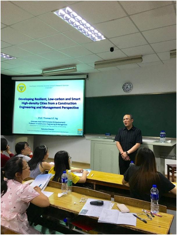晚上,来自香港大学的Thomas Ng教授给学员们带来了题为“Developing Resilient,Low-carbon and Smart High-density Cities from a Construction Engineering and Management Perspective”的讲座。Thomas Ng教授从灾害的严重性讲起,引出社区韧性(community resilience)的重要性以及韧性对于不同城市的不同意义。接着,Thomas Ng教授介绍了中国大陆基础设施机构和香港基础设施机构,以及高密度城市的特征和基础设施的内在联系。最后,Thomas Ng教授为大家介绍了潜在技术创新,并做出总结:可持续发展和韧性对高密度城市的发展至关重要。