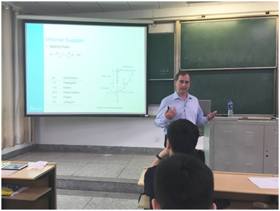 陆勇教授的报告主要包括强动力响应、大应变下的材料性质和结构连续倒塌的分析方案三方面内容。他指出梁柱模拟模型已经广泛应用到以构件为主的响应分析中,在强动力作用下传统的分析方法虽然易于实施,但存在局限性,未来研究的发展方向将是破坏过程分析与模拟。在讲授过程中,陆教授上下半场分别采用英文和中文授课,为学员带来不一样的学习体验。