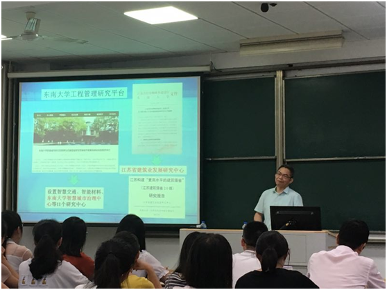 李启明教授首先简单介绍了东南大学工程管理专业的相关特色以及主要的研究方向,并对课题组的研究方向做了简单概述。然后李启明教授针对报告主题,首先对国际建筑行业的整体情况,世界各地区以及不同国家的市场现状进行具体介绍和对比,范围由大入小,结合大量图表数据,内容丰富严谨,却又不失幽默。李启明教授着重讲解了江苏建筑企业和全国其他省份企业在建筑行业市场上的分析对比以及相关的政策介绍,给我们带来了一场知识盛宴。