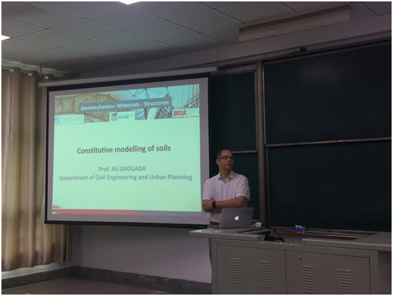 下午,来自法国里昂国立应用科学学院(INSA Lyon)的Professor Ali Daouadji给暑期学校学员带来题为〝Constitutive Modelling of Soils〞的专题报告。
