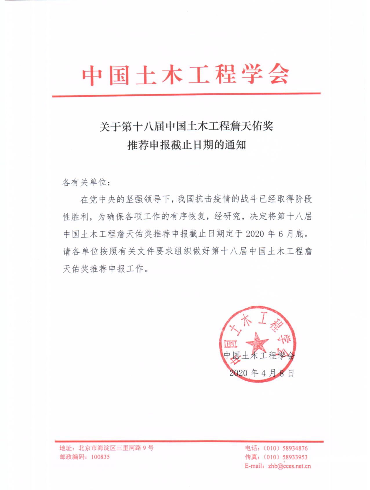 在党中央的坚强领导下,我国抗击疫情的战斗已经取得阶段性胜利,为确保各项工作的有序恢复,经研究,决定将第十八届中国土木工程詹天佑奖推荐申报截止日期定于2020年6月底。请各单位按照有关文件要求组织做好第十八届中国土木工程詹天佑奖推荐申报工作。