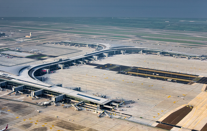 卫星厅主体结构采用钢筋混凝土框架结构,中央大厅屋盖采用钢结构桁架,登机桥采用钢结构,总用钢量约3.5万t。