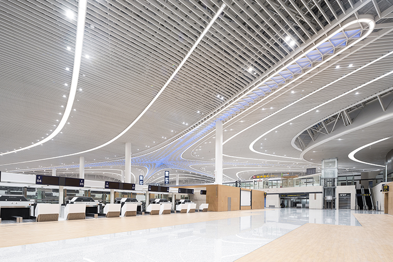 工程总建筑面积74.2万m2,设计目标为2025年旅客吞吐量3500万人次。航站楼工程建筑面积53.2万m2,建筑高度42.15m,屋面面积22万m2,为国内首个全球最大焊接不锈钢屋面。航站楼大厅与五指廊融为一体,旅客步行距离短。国际指廊居中,中转高效、流程便捷。综合交通中心工程建筑面积21万m2,建筑高度20.85m,地上二层、地下二层,其中停车楼面积13.8万m2,换乘中心面积4.3万m2,停车位3747