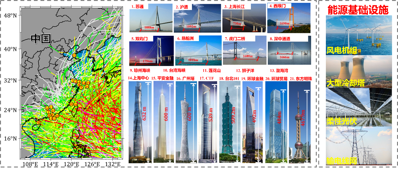 《标准》编制单位开展了我国众多桥梁和结构的抗风研究工作,在我国沿海地区积累了丰富的台风风场观测数据,依托江浙沪粤闽滨海区域风能和气象观测塔获取多年的实测台风风场数据,重构了西北太平洋台风风场历史演变数据,为本标准编写提供了大量详实的数据支撑。