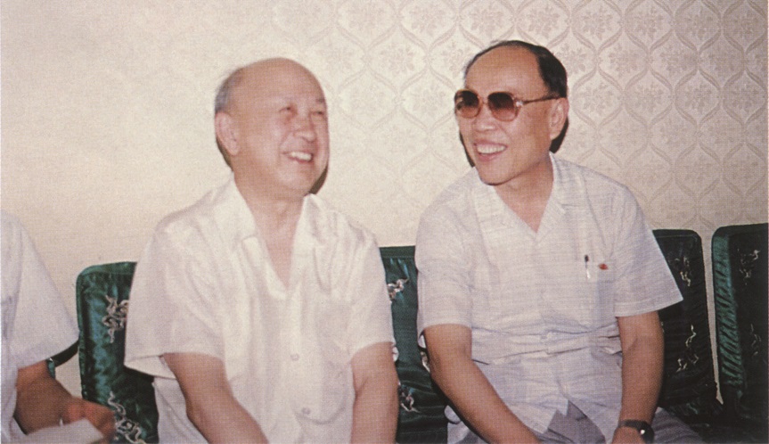 时任中国科协主席钱学森与李国豪理事长在“从事土木工程工作50周年老专家”表彰大会上亲切交谈(1987年7月)