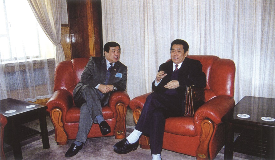 时任交通部副部长李居昌、铁道部副部长蔡庆华在出席学会第七次全国代表大会上交谈(1998年3月)