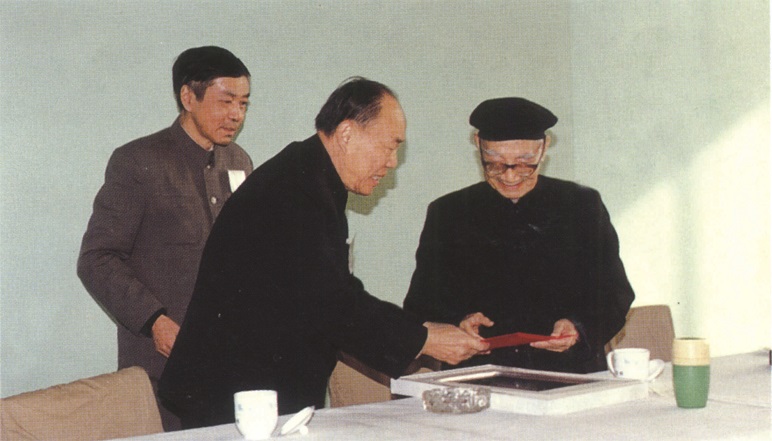 李国豪理事长在第四届理事(扩大)会议上向茅以升名誉理事长授予荣誉证书,表彰他为学会创建和发展作出的重大贡献(1984年12月)