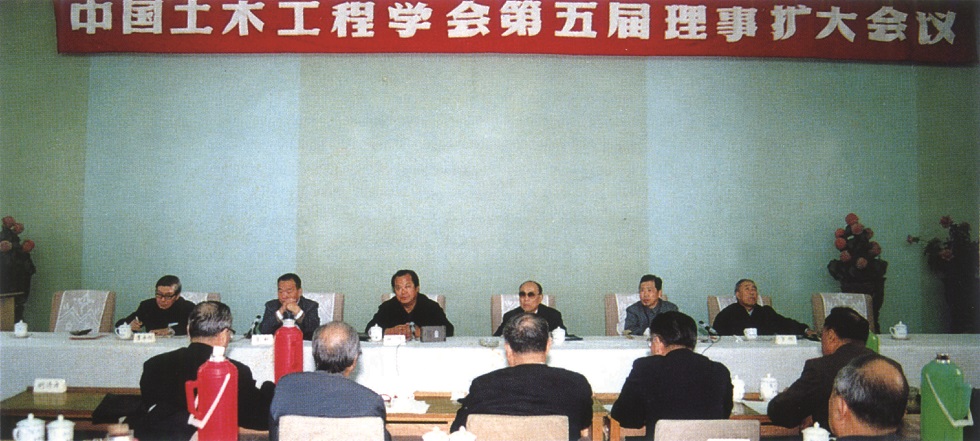 中国土木工程学会第五届理事扩大会议(1988年11月)(左起:李承刚秘书长、肖桐副理事长、建设部林汉雄部长、李国豪理事长、中国科协书记处第一书记高镇宁、子刚副理事长)