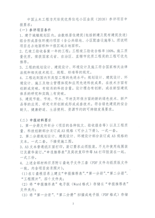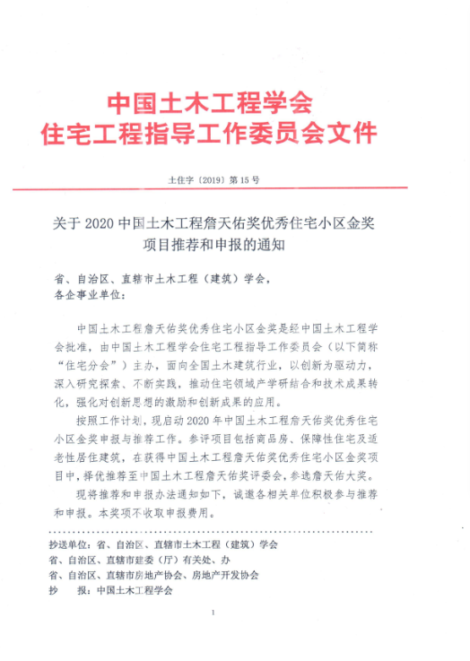 关于2020中国土木工程詹天佑奖优秀住宅小区金奖 项目推荐和申报的通知