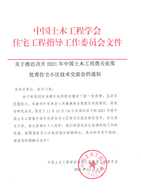 关于推迟召开2021年中国土木工程詹天佑奖 优秀住宅小区技术交流会的通知