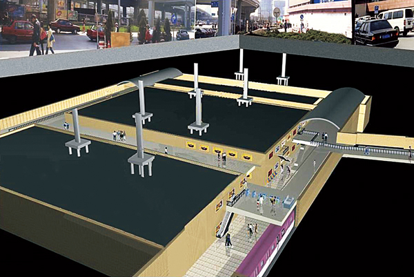 一、工程概况 北京地铁10号线国贸站为一座与地铁1号线换乘的大型换乘车站,车站处在北京市CBD核心区域东三环中路与建外大街交叉口处,呈南北走向,按分离岛式车站设计,复合式衬砌结构。其主洞室设计长度131.2m,最大单跨开挖宽度15.15m,高度19.386m。两个主洞室之间内接两个客流通道与一个设备联络通道,外连东北、西北和南侧三个风道,共设东北、西北(AB)、东南四个出入口以及一个换乘通道。总建筑面积为18,955.8㎡。 国贸站位于国贸立交桥下,桥桩密集,管线密布,设站条件非常苛刻,周边环境条件特别敏感。国贸站是首次在桥区采用浅埋暗挖法修建的大型地铁车站,主要采用洞桩法、CRD法与台阶法进行施工。站址处工程地质与水文地质条件复杂,结构上方上层滞水饱和,拱部多为中细砂与粉细砂,受动荷载影响明显,车站开挖成拱条件极差,施工难度极大,工程风险极高。 工程于2004年3月开工建设,2008年4月竣工,总投资2.5亿。